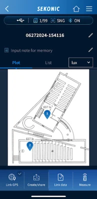 SEKONIC LD offers upgrade option with in-app purchases (3-month subscription, 12-month subscription), including a 2-week free trial. With the upgrade, you can import drawings such as lighting layouts or site photos, and link measured values directly on them. Even if you stop the measurement midway, you can add notes to the saved data, making it convenient for multiple measurements. You can also attach smartphone images and notes to each measurement data. Location information of sites can also be attached with GPS data. Compile project data into simple reports, output as PDFs, or export as CSVs for further processing.